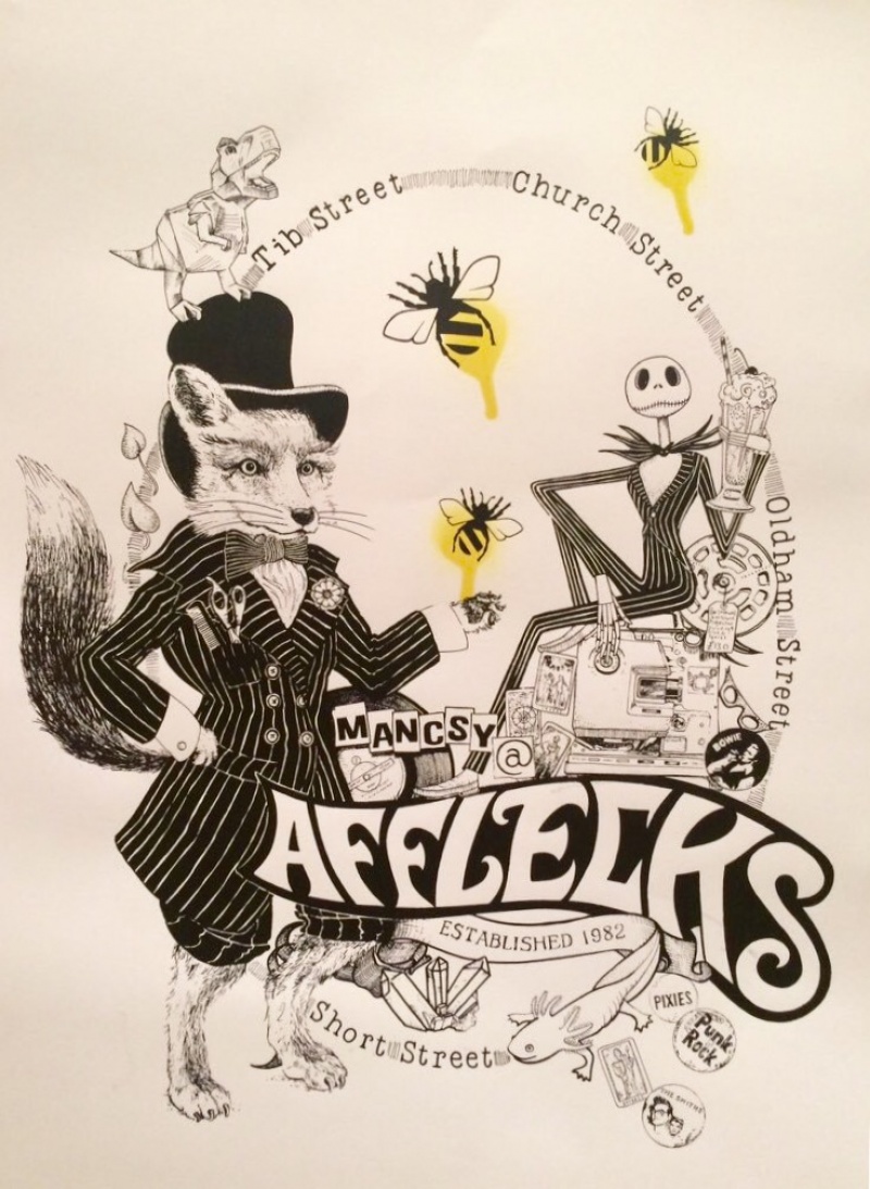 I have many friends in Afflecks Manchester and this print celebrates the great people who work in the indie emporium in Northern Quarter and happy memories shopping there as a child and visiting the axolotls. This print is not available for sale.